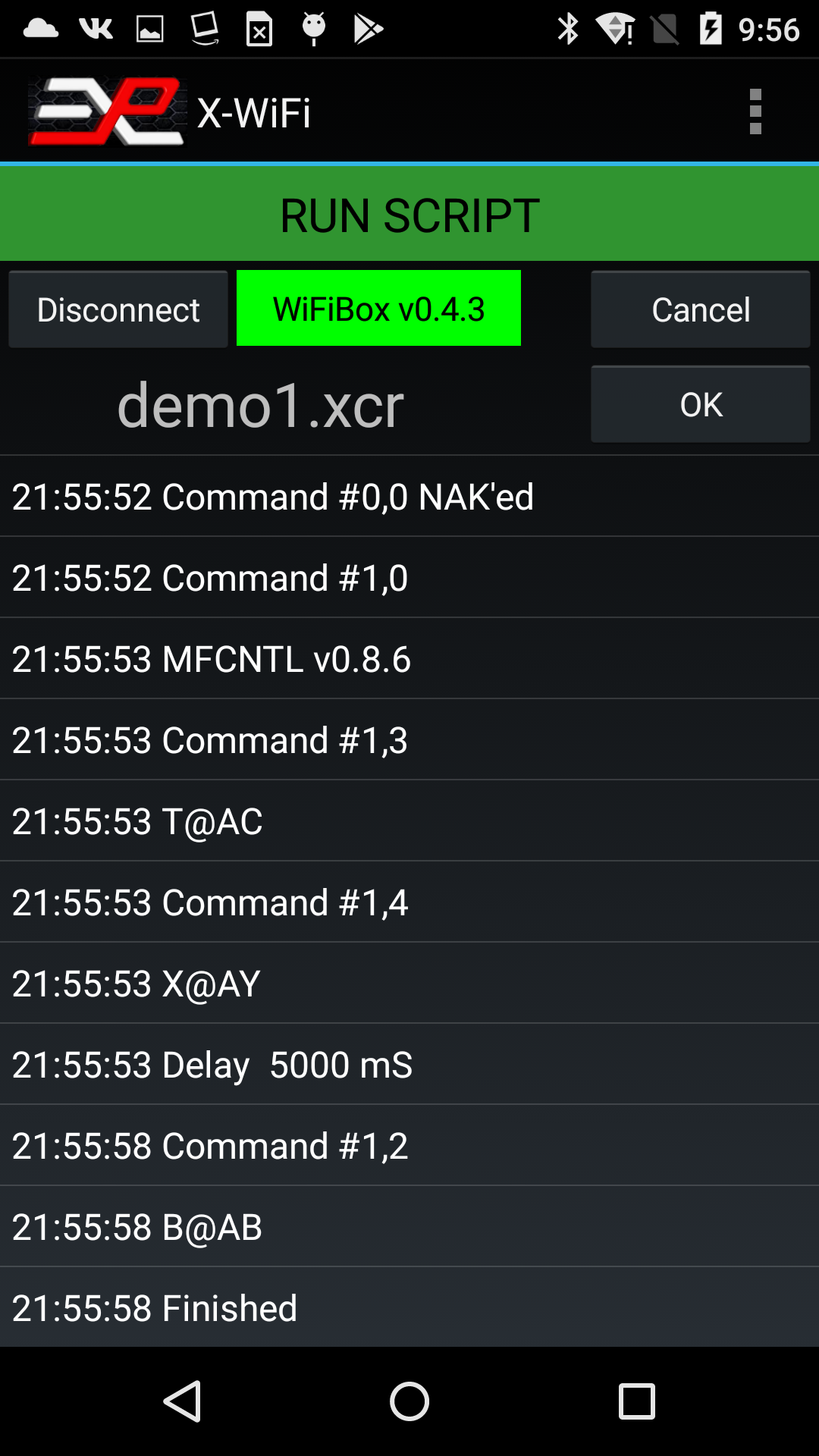 The execution of a script is verified on the screen. The picture below shows the execution of the script above: