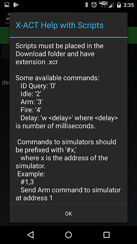 A script is a text file stored in the Download folder of your tablet that contains a sequence of commands and optional delays. Here is an example which arms two simulators, fires them at 1 seconds interval and return them to Idle mode.